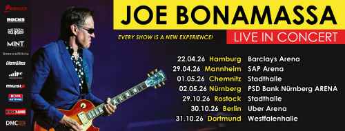 Joe Bonamassa, der Blues-Rock Superstar wird 2026 für 7 Shows nach Deutschland kommen. Der Start seiner Tournee wird am 22.04.2026 in der Barclays Arena in Hamburg stattfinden. Insgesamt 7 Shows stehen auf dem Programm. Die Tournee, die im April mit 4 Terminen startet, wird Ende Oktober mit weiteren 3 Shows fortgesetzt.